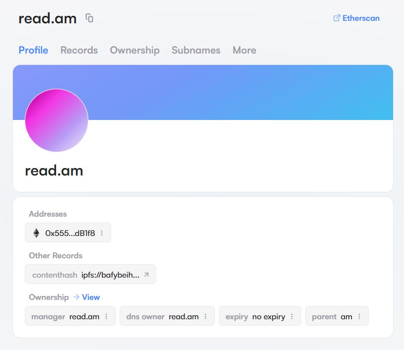 A .am ccTLD domain name “Read.am” onchain with ENS